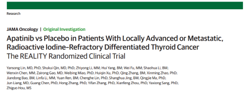 2021年12月16日,权威医学杂志《JAMA Oncology》(影响因子31.777)在线发表阿帕替尼的一项III期临床研究(REALITY)——甲磺酸阿帕替尼片治疗局部进展/转移性放射性碘难治性分化型甲状腺癌(RAIR-DTC)患者的多中心、随机、双盲、安慰剂对照临床研究。此研究由北京协和医院的林岩松教授和南京金陵医院的秦叔逵教授发起,在全国21个研究中心展开,由尊龙凯时医药中央医学事务部团队支持完成。